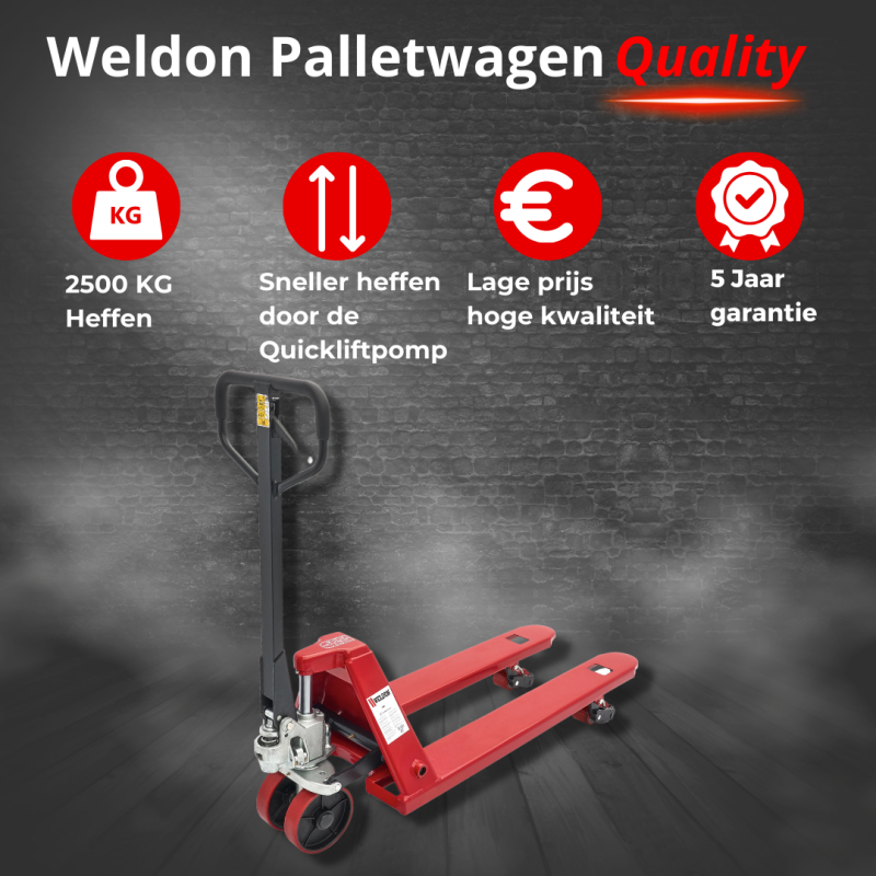 De handpalletwagen QPD-Q is uitgerust met een quicklift-systeem met een gebruiksvriendelijke snelheffunctie. Dankzij de quicklift is het mogelijk om snel druk op te bouwen met minder pompbewegingen. Hierdoor kunt u sneller werken en met minder inspanning. Met een hefvermogen van 2500KG heft de palletwagen eenvoudig al uw lasten.